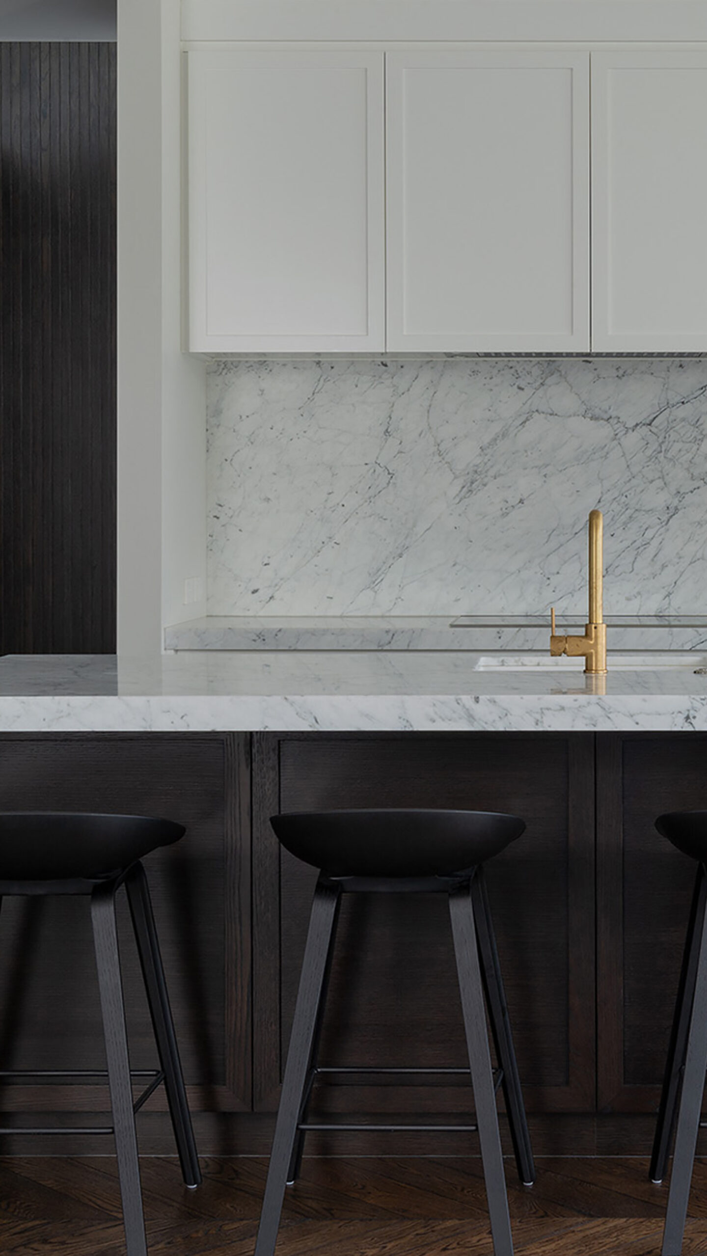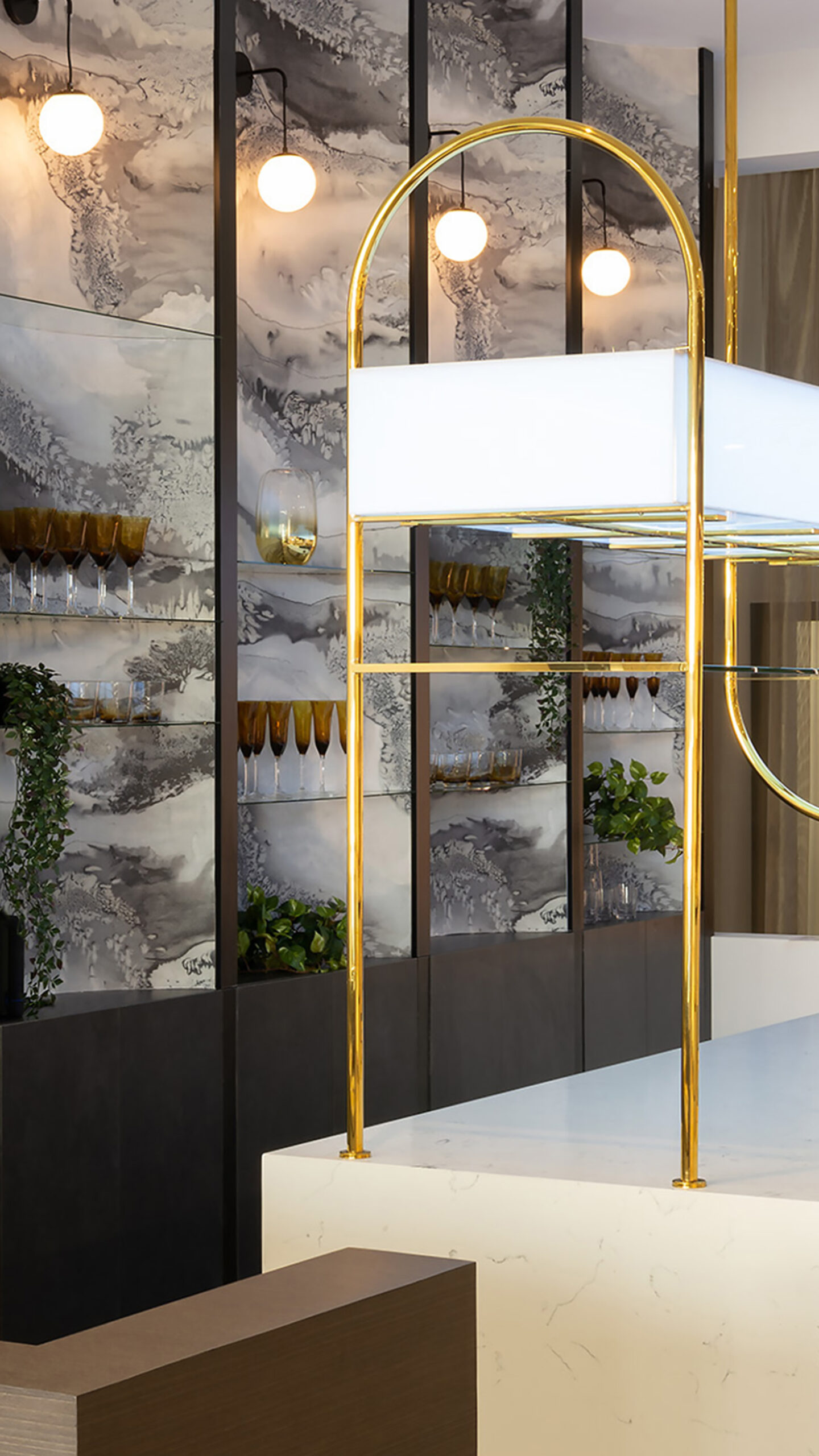 Spatial Studio designed the first point of entry with Silver Travertine stone floors and Oak batten wall detail which flows into the reception area with the custom designed stone counter.
