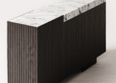 The Segment Console No.3 juxtaposes solidity and fineness within the design details. Mitered natural stone unseen along the front edge with a play on scale for each material offers unique display options and hidden storage within for your entry, hall, bar or living space. There are three push to open cupboards with an adjustable shelf inside of each.